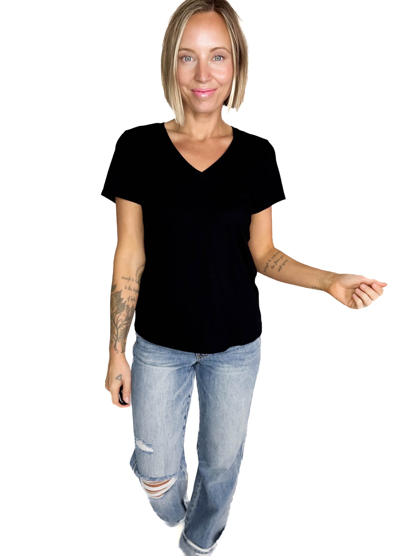 Eleni Cotton Jersey V-Neck T- Shirt- BLACK