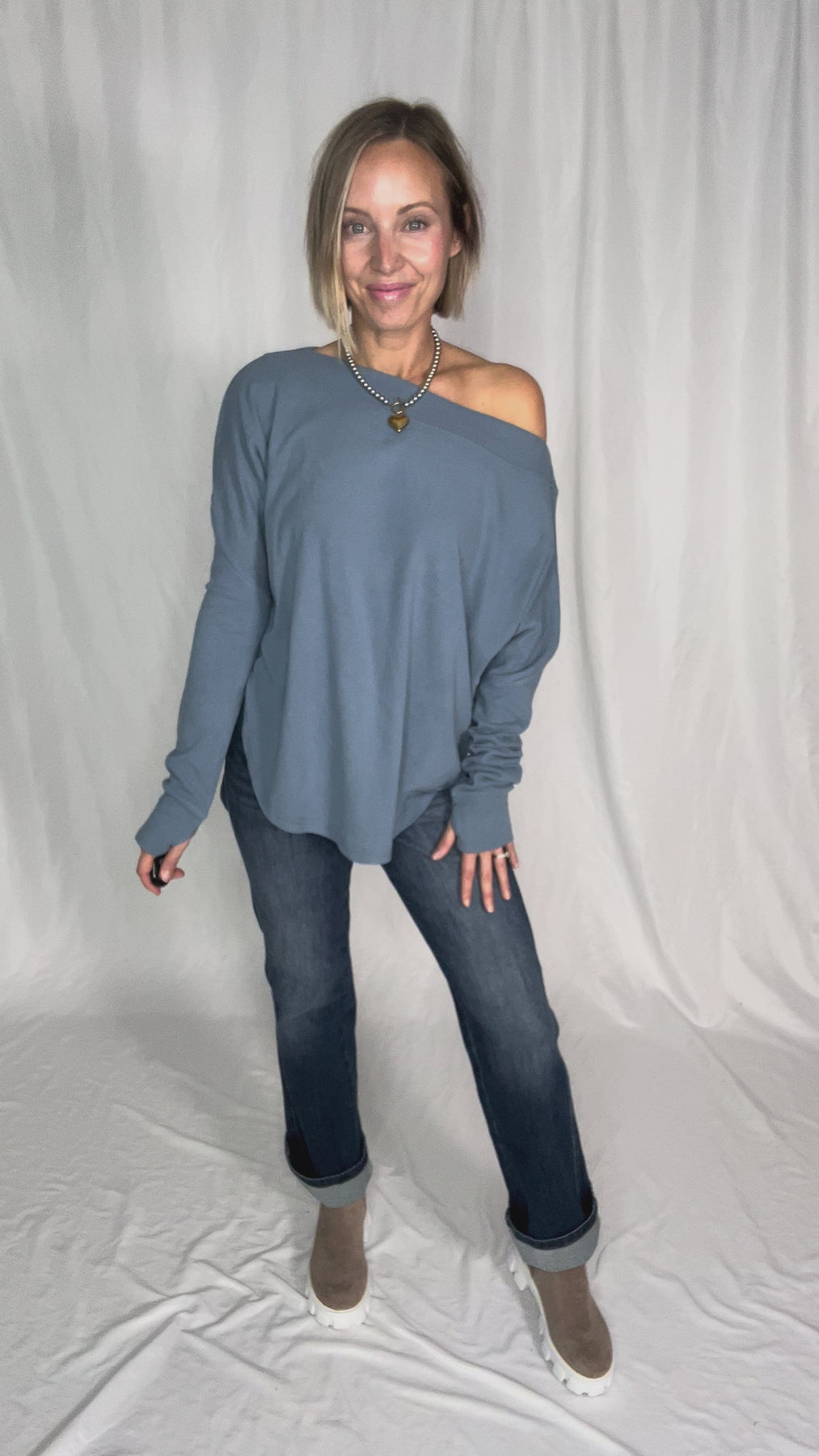 - Flattering boat neckline with a relaxed silhouette