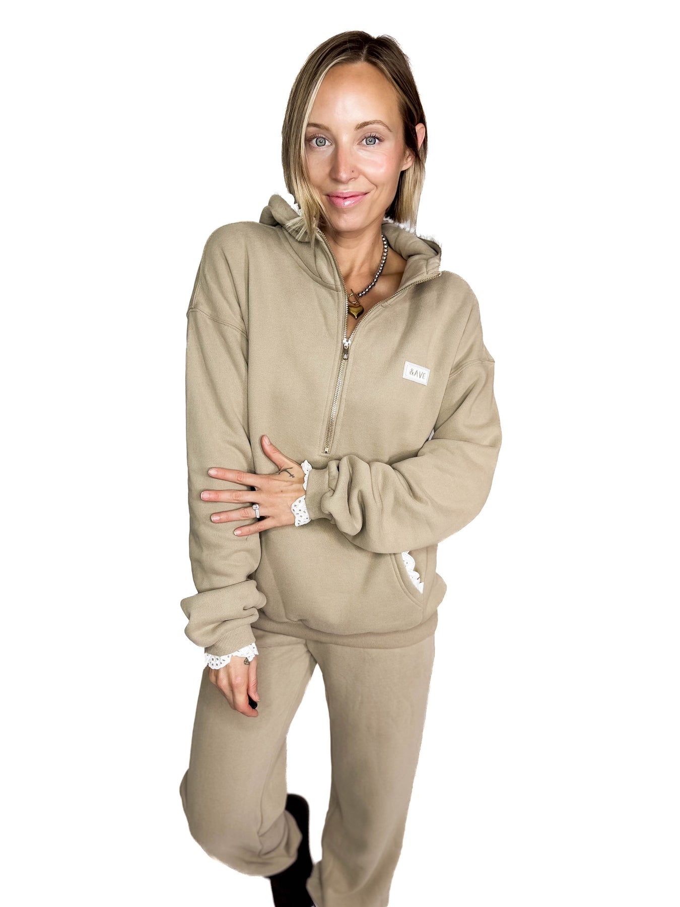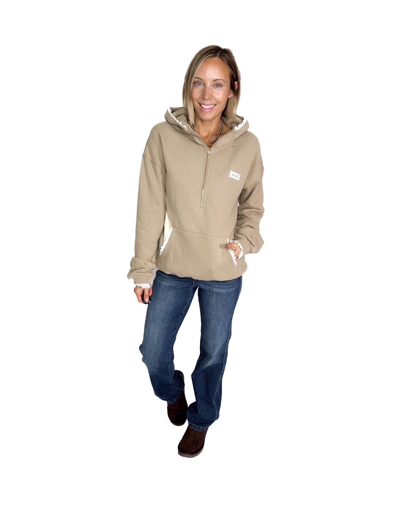 Additional: Gold 1/2 Zip, Hood with Lace Trim, Kangaroo Pocket with Lace Trim, Cuffs with Lace Trim, Fleecy Interior, Ribbed Hem and Cuffs, Warm