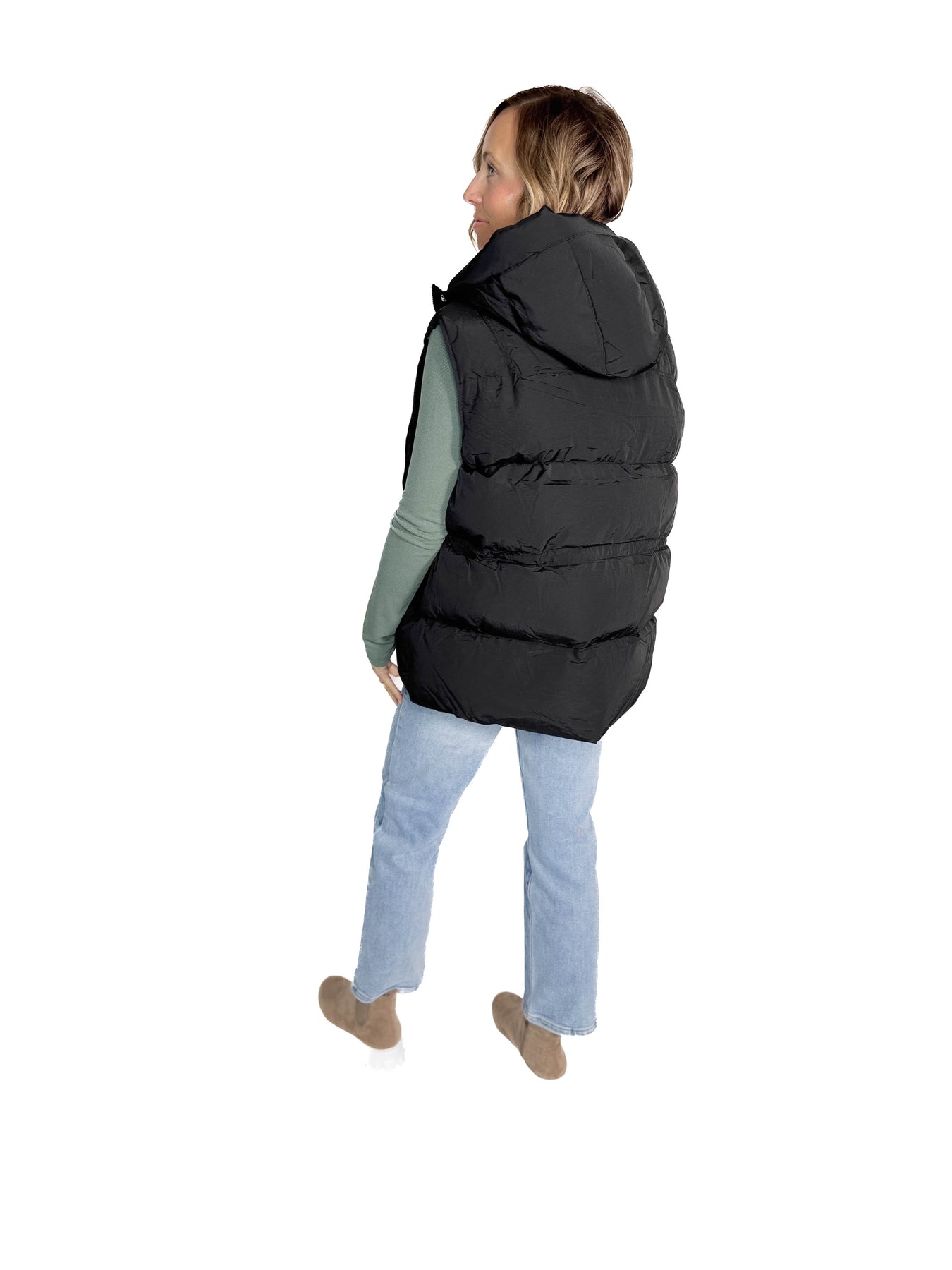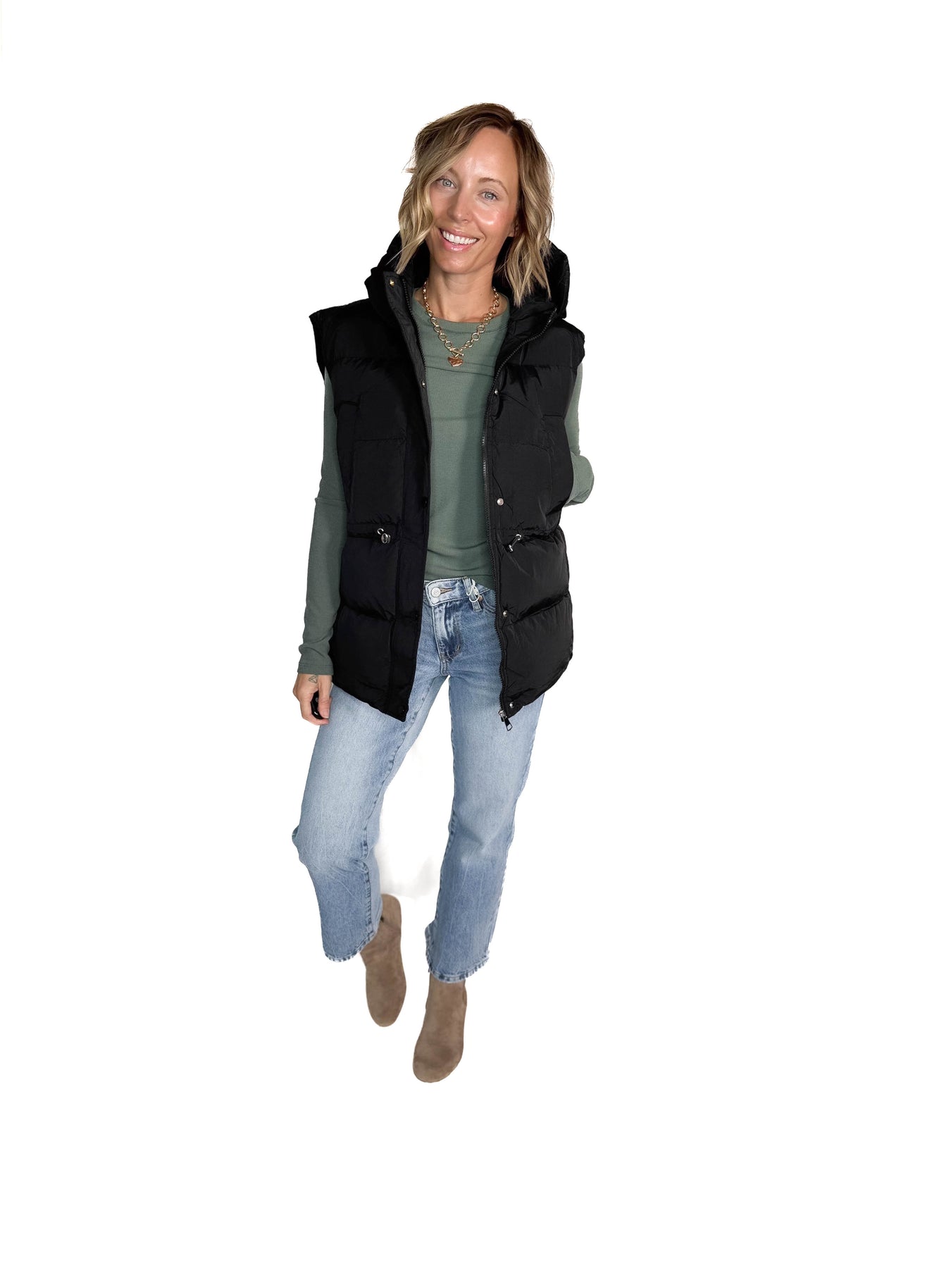 Additional: Puffy Hooded Vest, Cinch Cord Waist, Snap & Zipper Closure, Lined, Functional Pockets