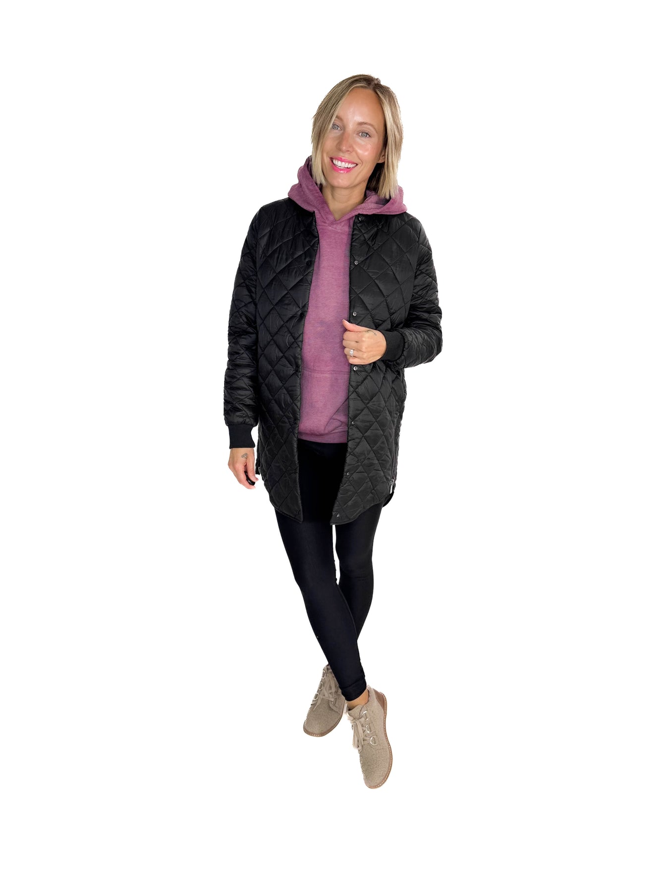 Quilted comfort meets stylish design — high-low hem, snap closures, and side zips for that perfect extra give.