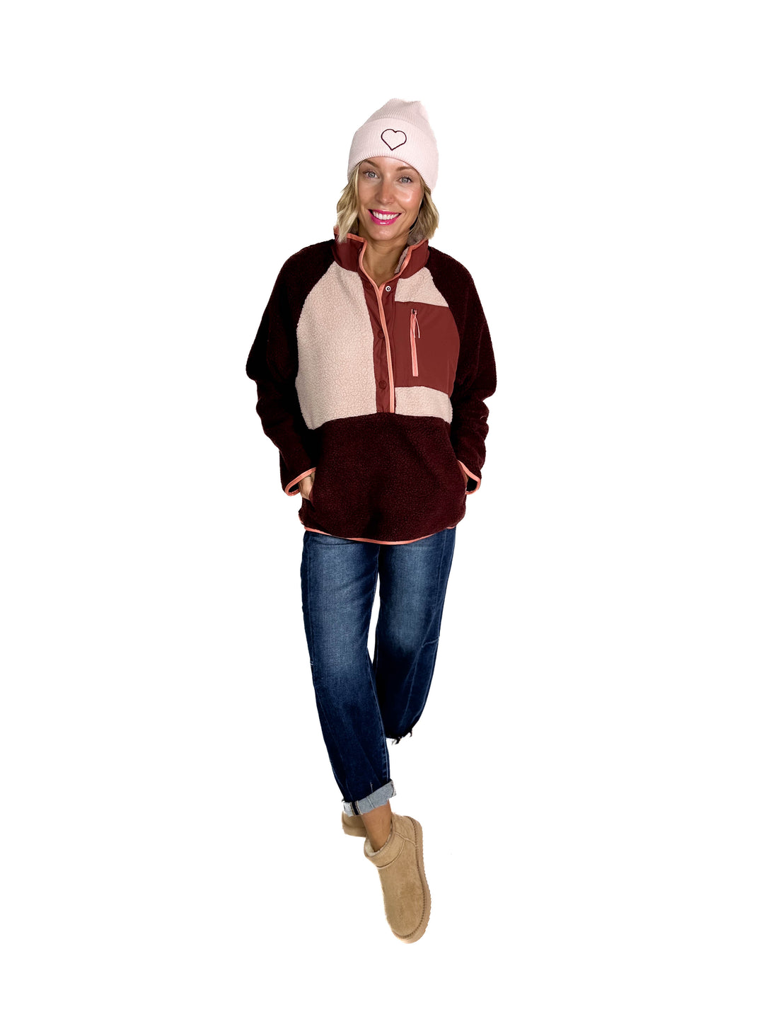 Tara Quarter Snap Sherpa Pullover- BITTER CHOCOLATE