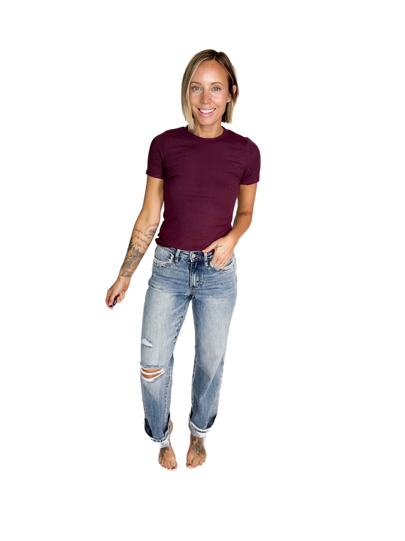 Additional: Rigid denim front, Judy Blue stretch back, straight leg silhouette, light distressing, medium wash, styled with cuffed but is not stitched