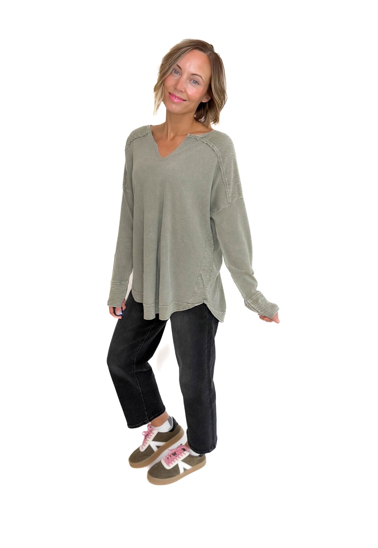 Additional: Waffle Knit, Notched Neckline, Inverted Seam Detail, Elbow Patches