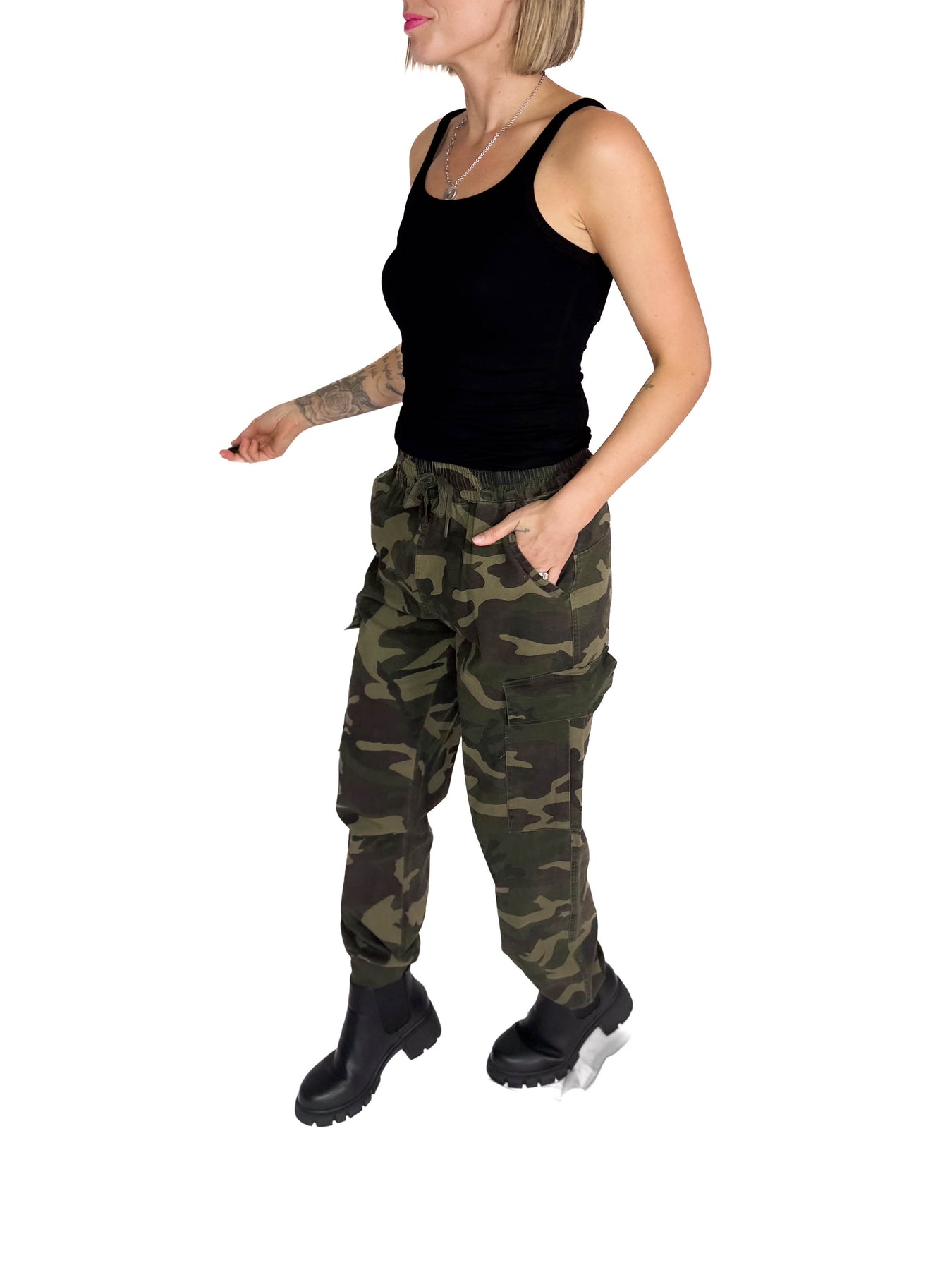 Additional: Drawstring waistband, elastic cuffs, camo print, side pockets, soft interior