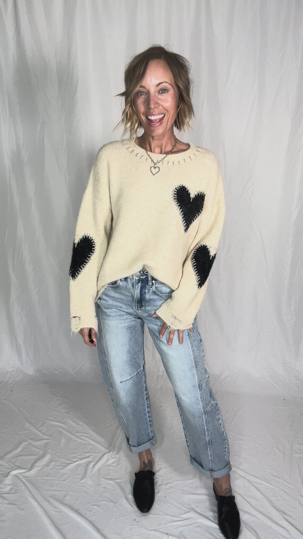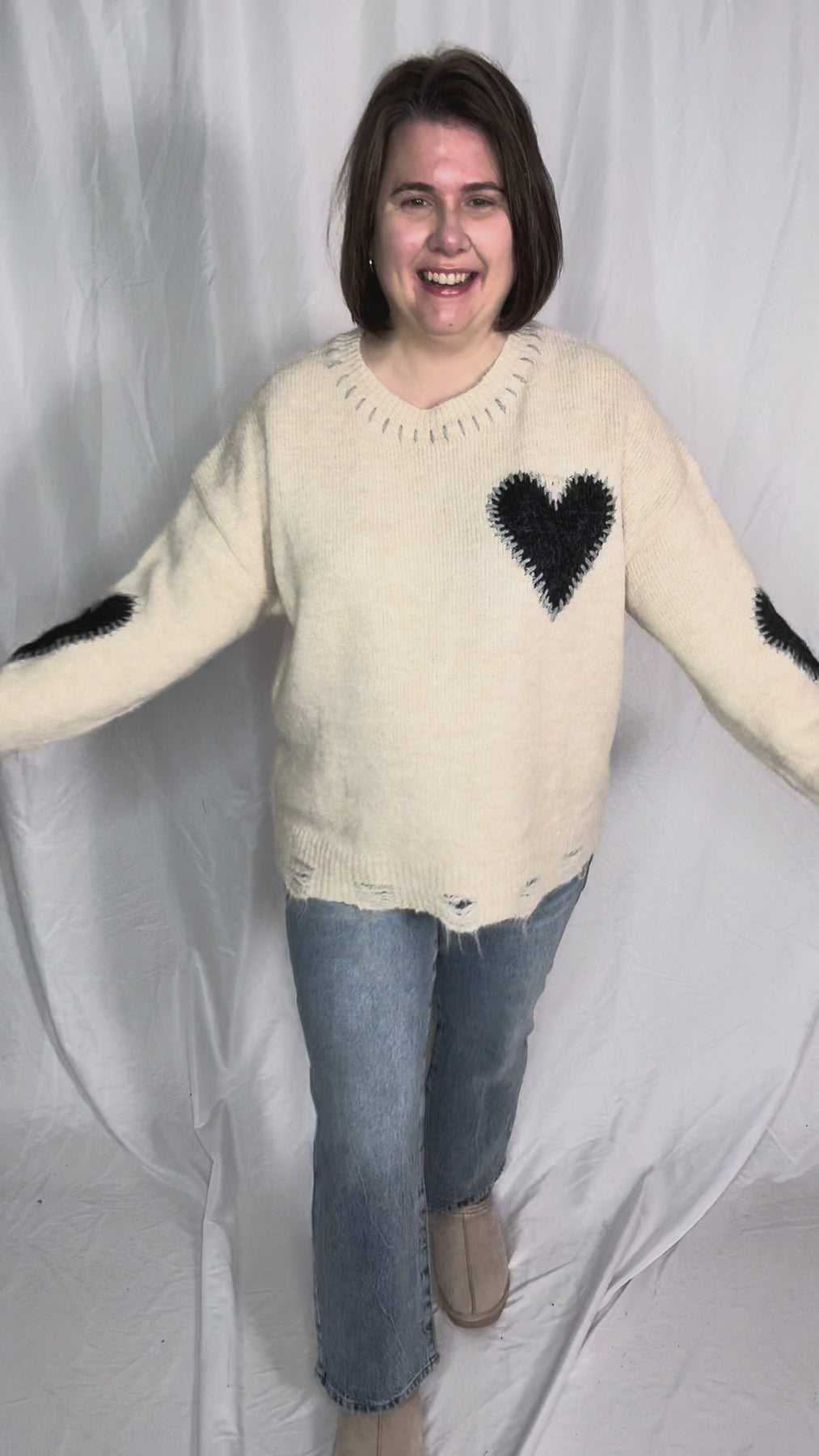 Additional: Knit Long Sleeve Pullover, Distressed Edges, Stitched Heart Details, Contrast Stitching, Crew Neck