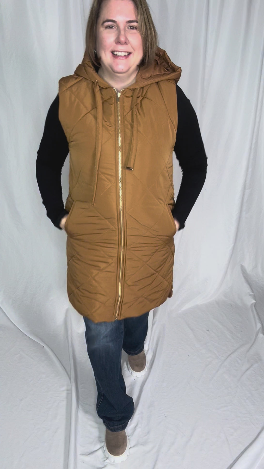 Additional: Padded Vest, Hood with Drawstring, Gold Tooling, Full Front Zip, Pockets, Lined, Side Slits