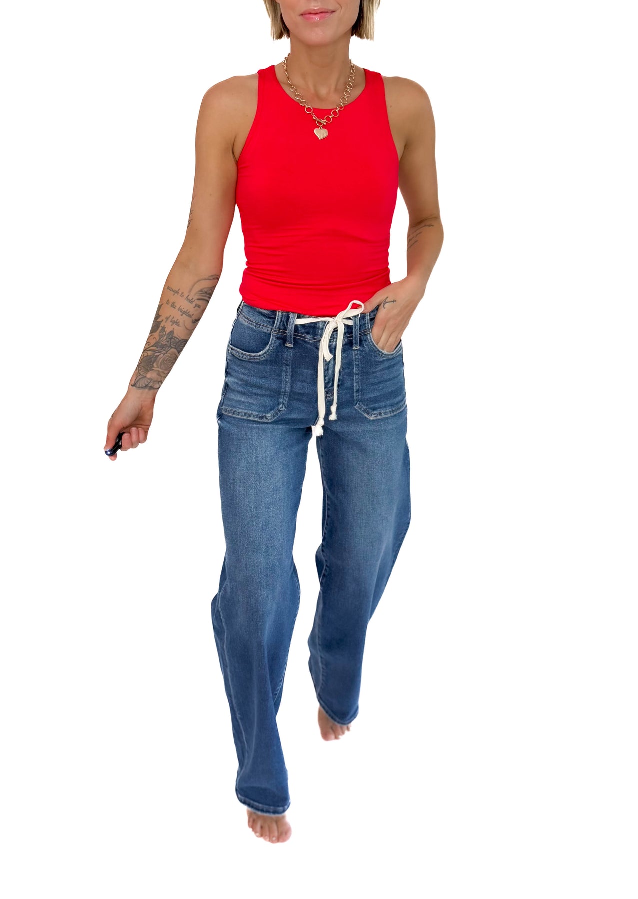 Additional: Drawstring Tie Waist, Relaxed Straight/Barrel Leg, No Distressing