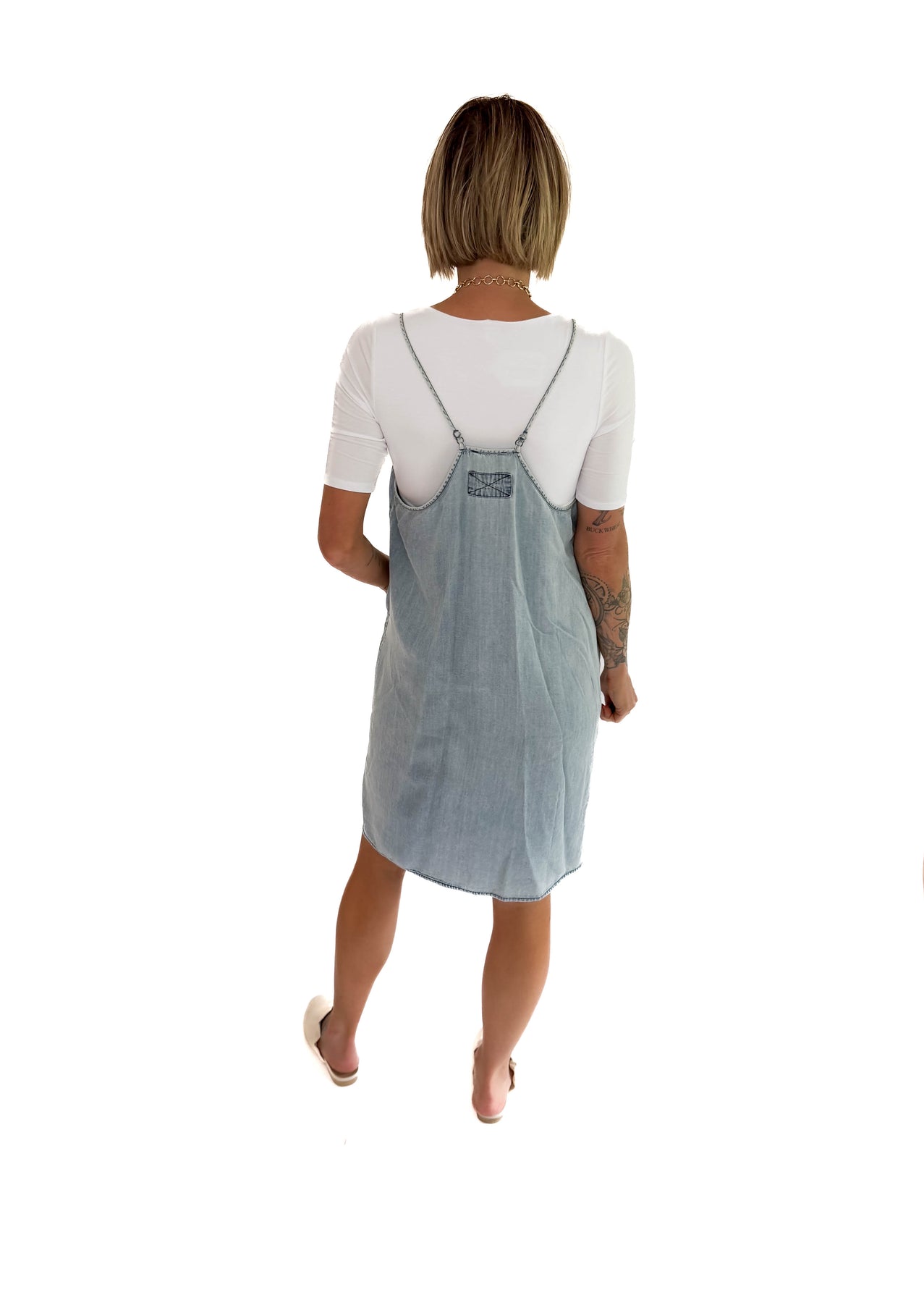 Additional: Mini Dress, Adjustable Spaghetti Straps, Denim Look Wash, Front Patch Pockets