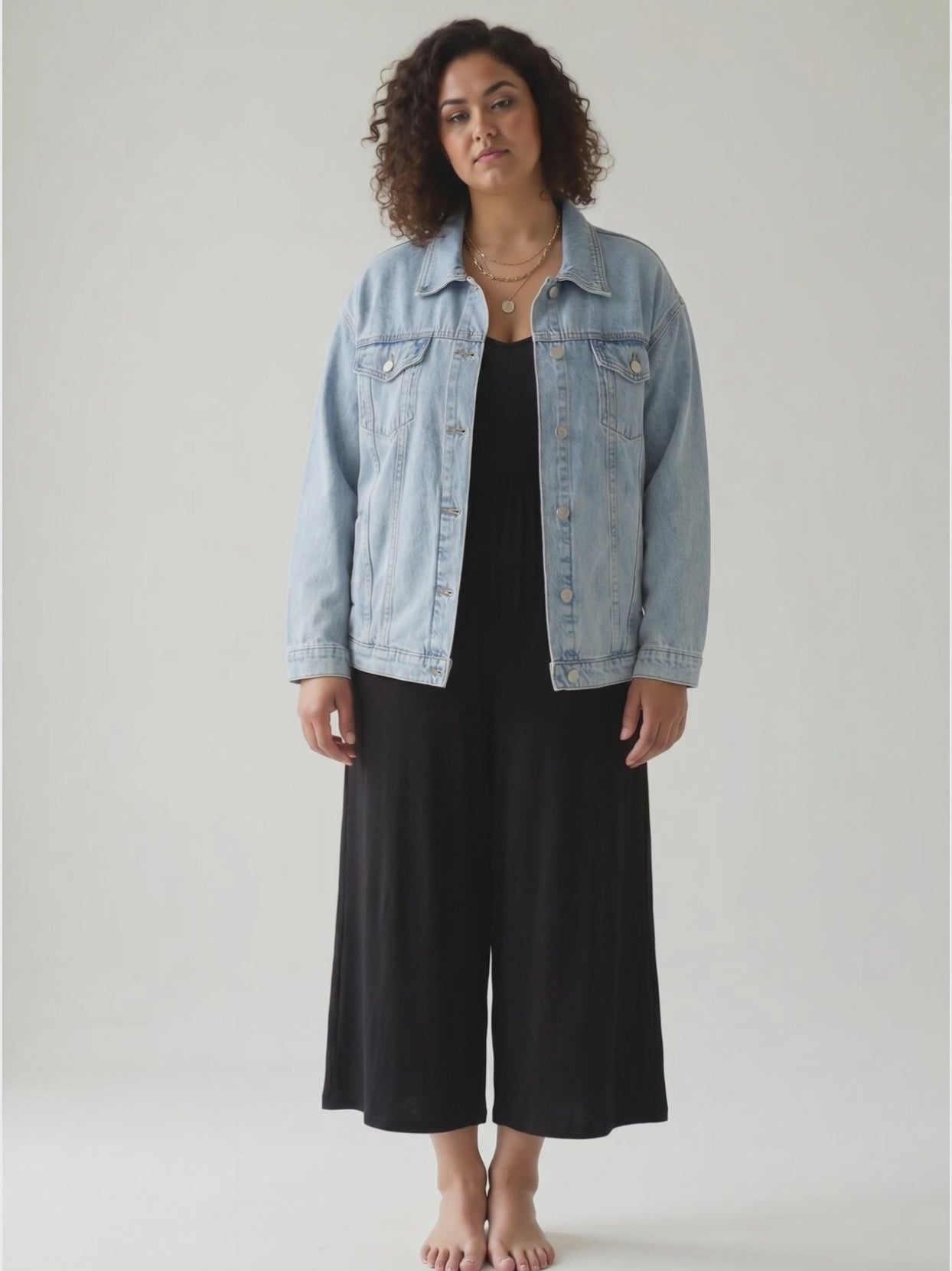 Additional: Full button up denim jacket, chest + side pockets, collared