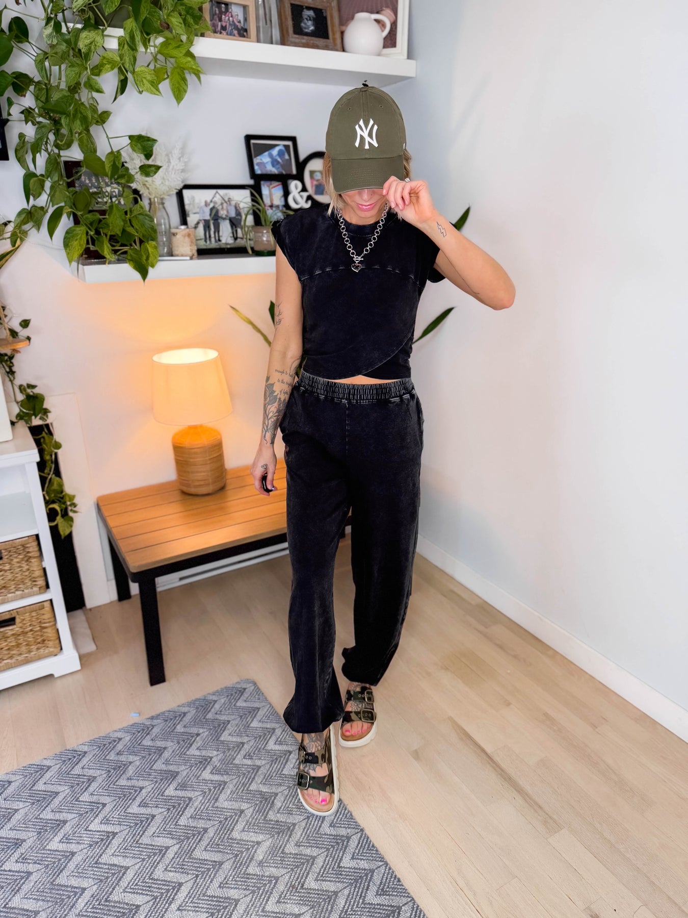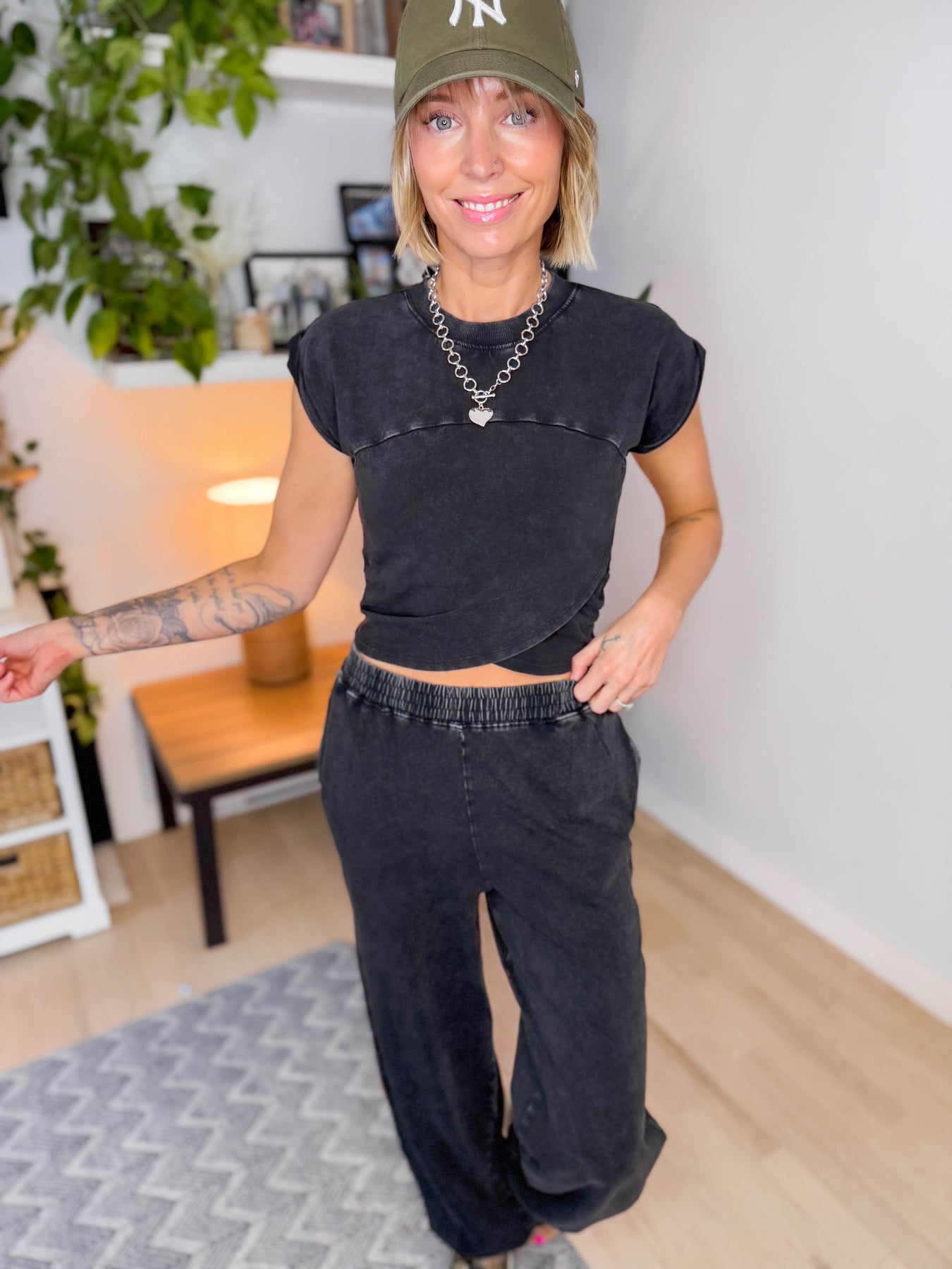 Additional: Top — Mineral wash fitted style with criss cross fold-over detail and stitched rolled cuffs