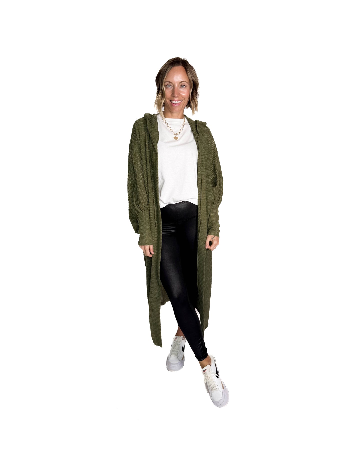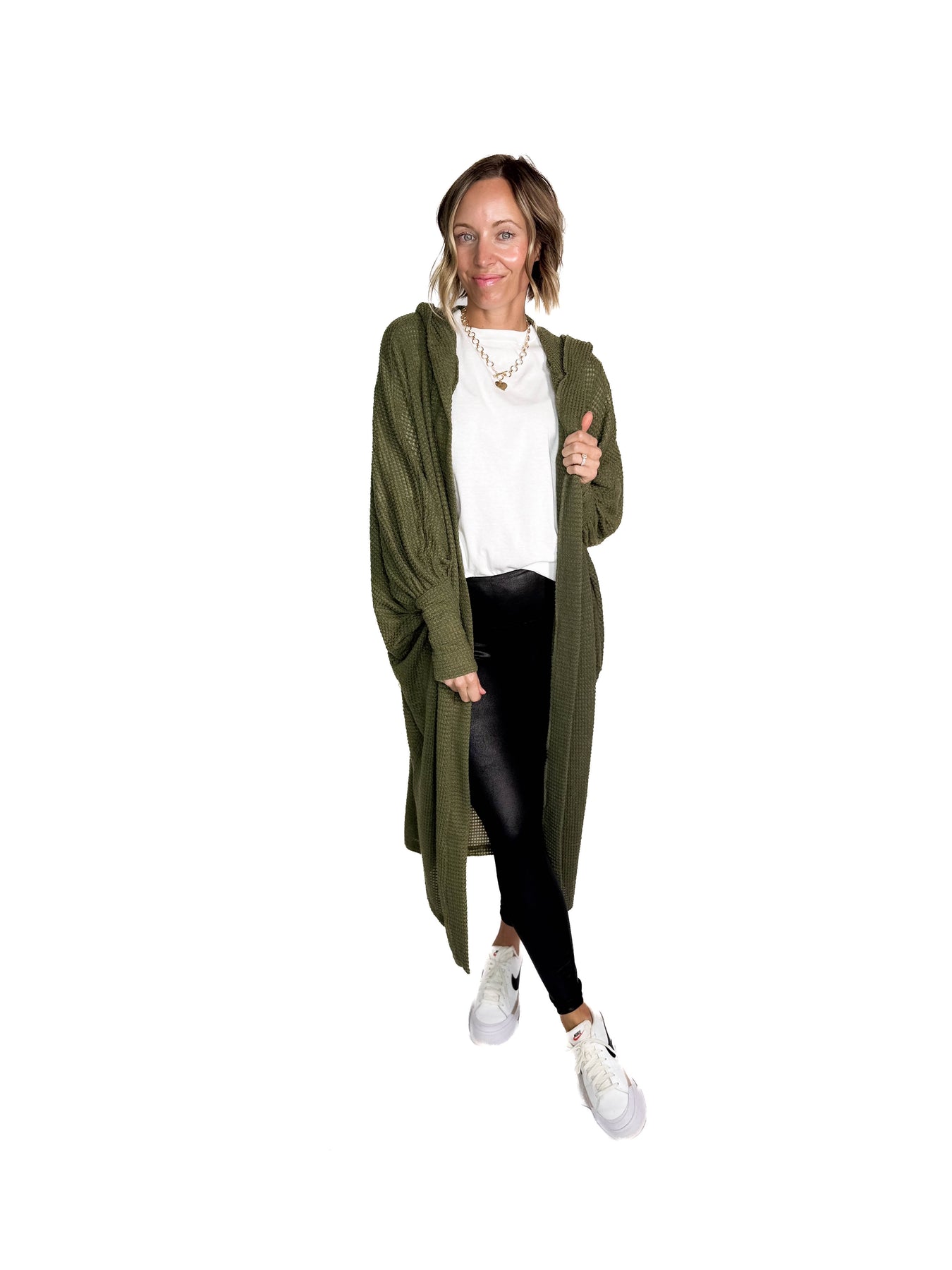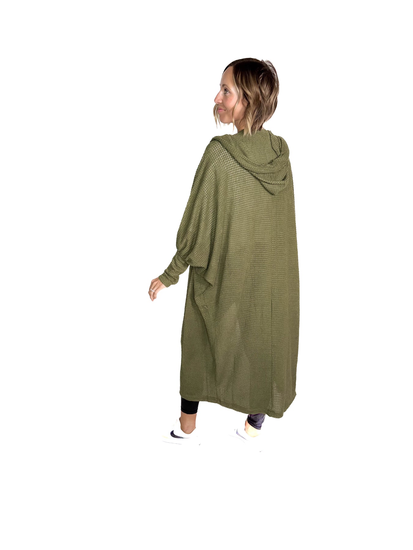 Additional: Hooded, Waffle Knit Texture, Longline Duster Style, Adjustable Drawstrings