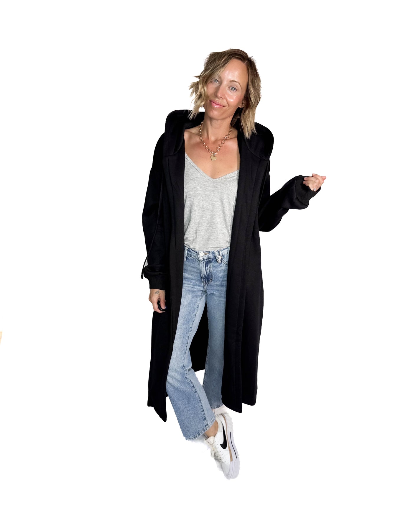 Additional: Open Hooded Cardigan, Warm & Cozy Feel, Longline Length, Front Pockets, Ribbed Cuffs, Adjustable Drawstrings