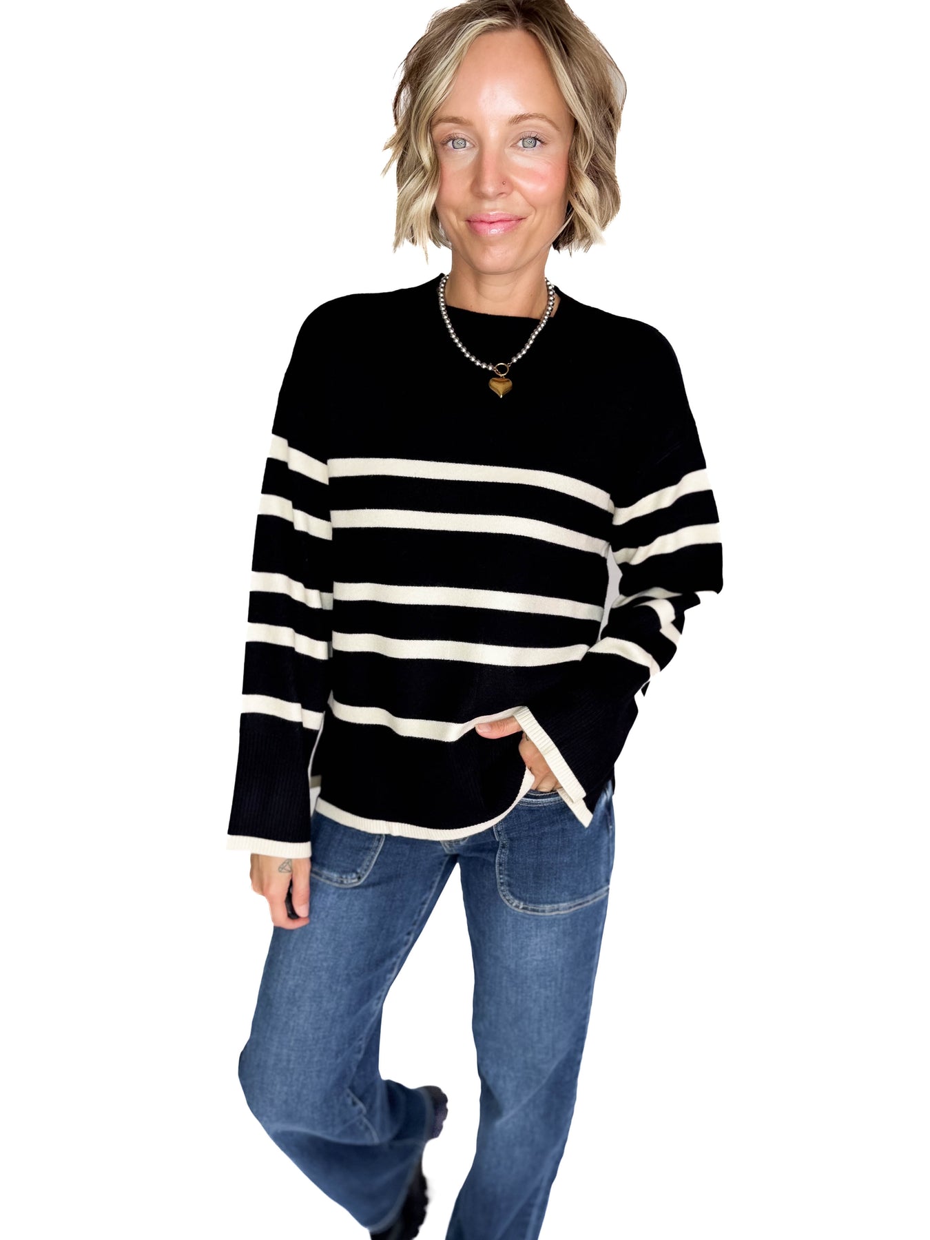 Soft stripes, sleek slits — the knit you’ll live in all season.