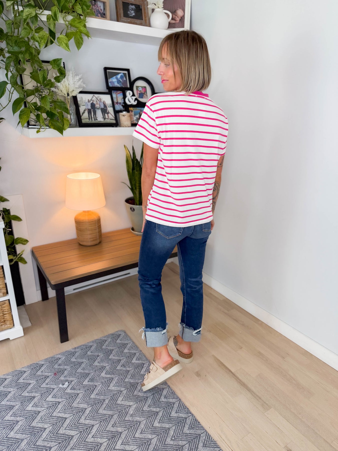 Marlene Striped Cotton T-Shirt- HOT PINK