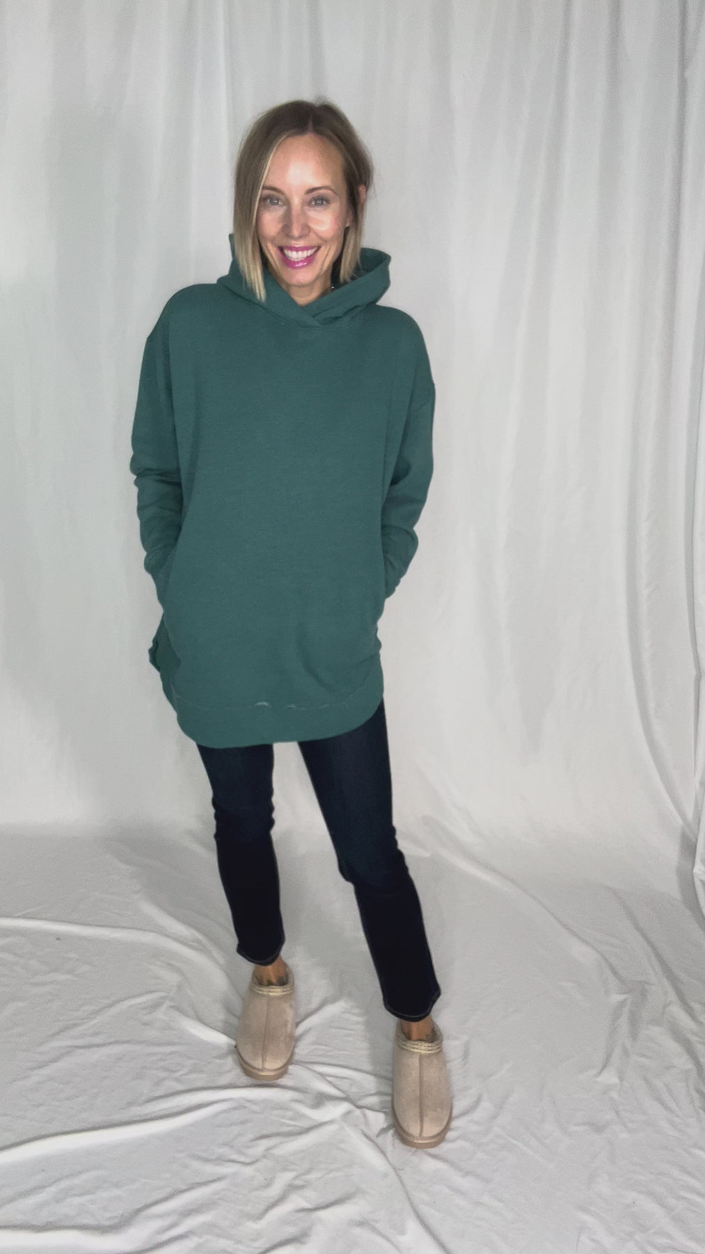 Additional: High-Low Rounded Hemline, Inverted Seam Details, Ribbed Cuffs, Side Pockets, Hooded Style