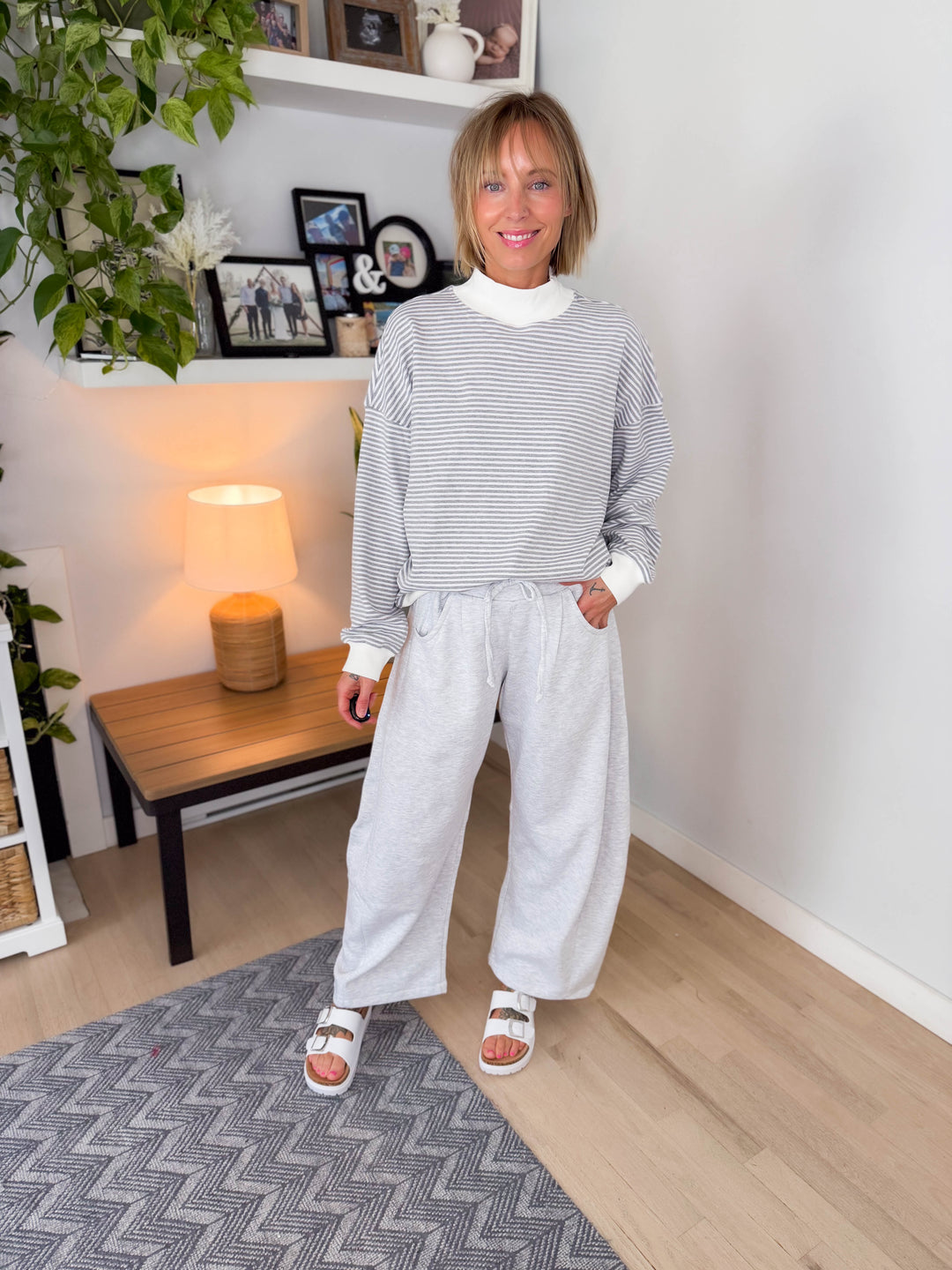 Annika Mock Neck Stripe Sweatshirt Top- HEATHER GREY
