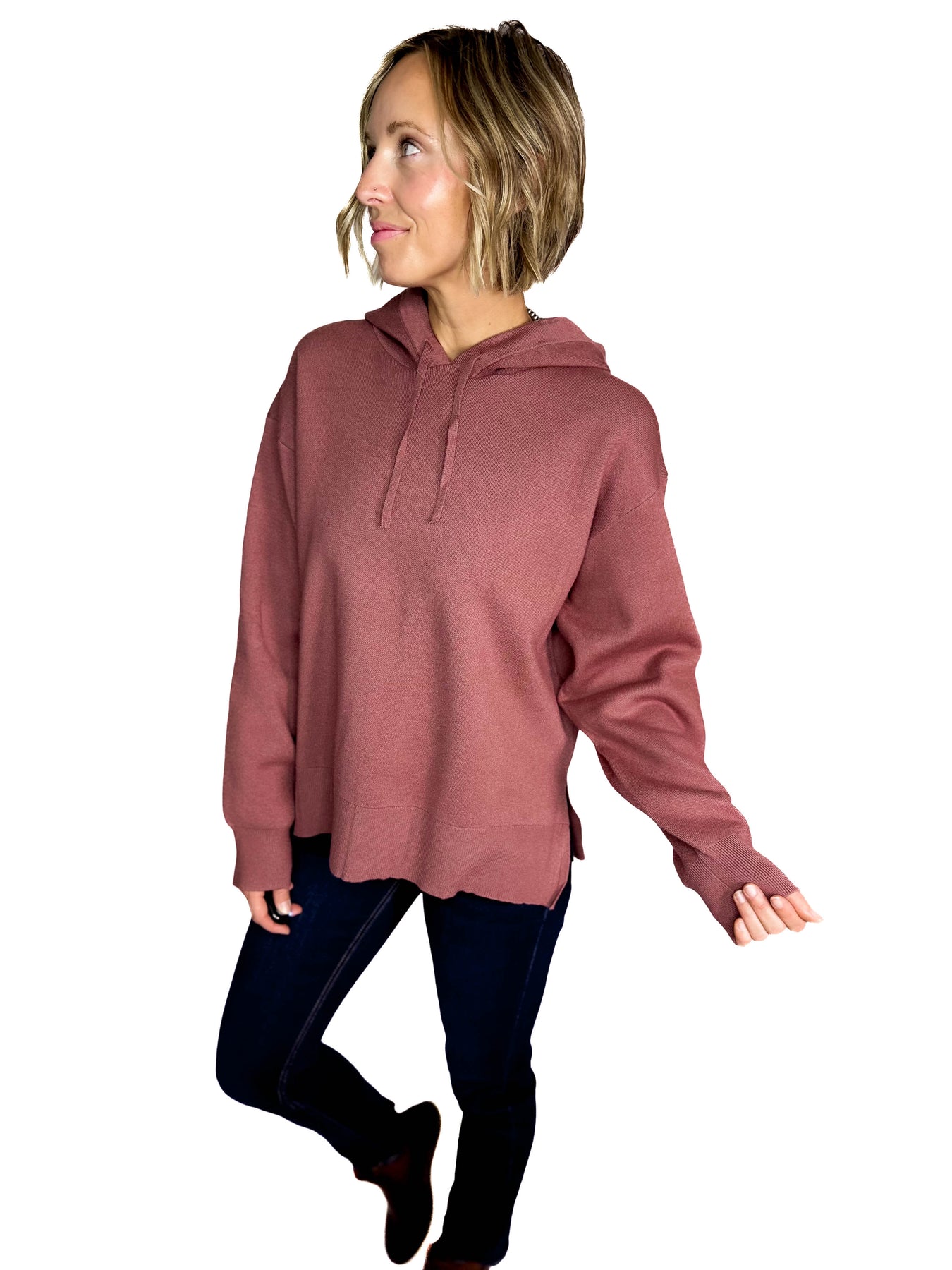 Cozy and effortlessly chic—this micro-knit hoodie with side slits and ribbed cuffs is your go-to for warmth and style.