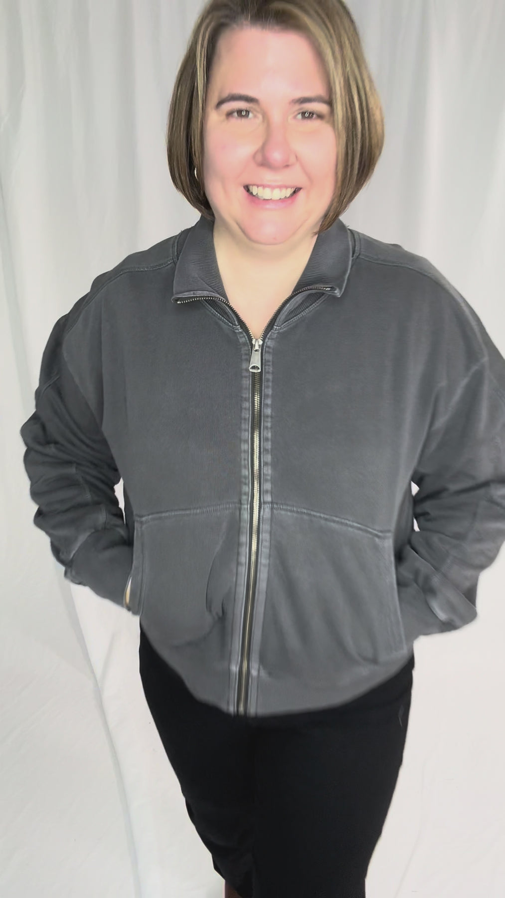 Adeline Cozy Acid Wash High Collar Full Zip- WASHED CHARCOAL