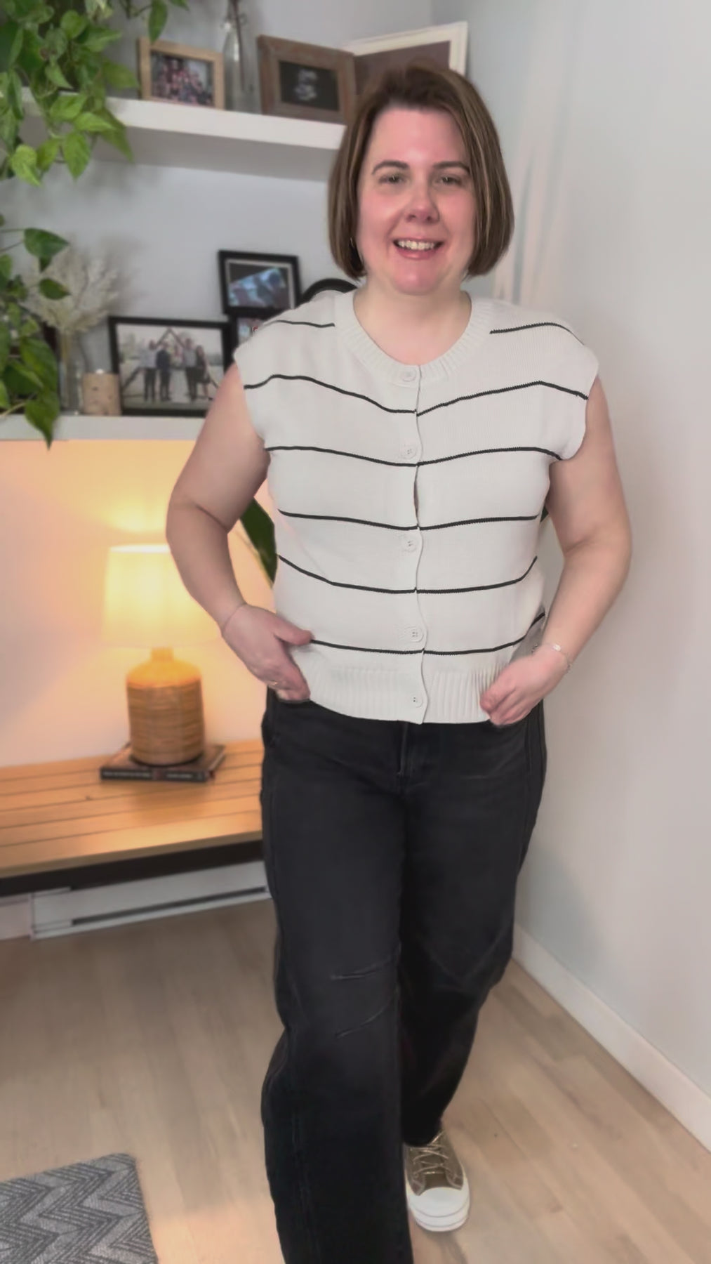 Hattie Round Neck Sleeveless Button Front Sweater Top- GREY/BLACK STRIPE