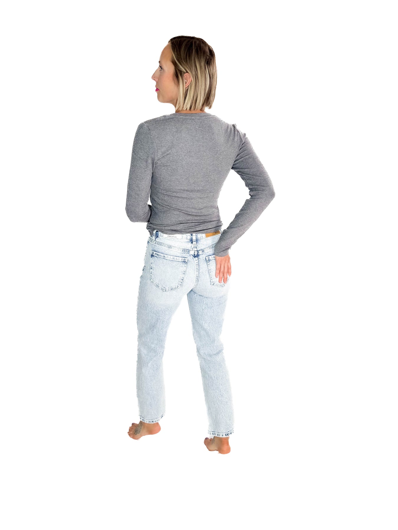 Effortless cool — light wash, distressed knees, and a high-rise straight leg for the perfect vintage vibe.