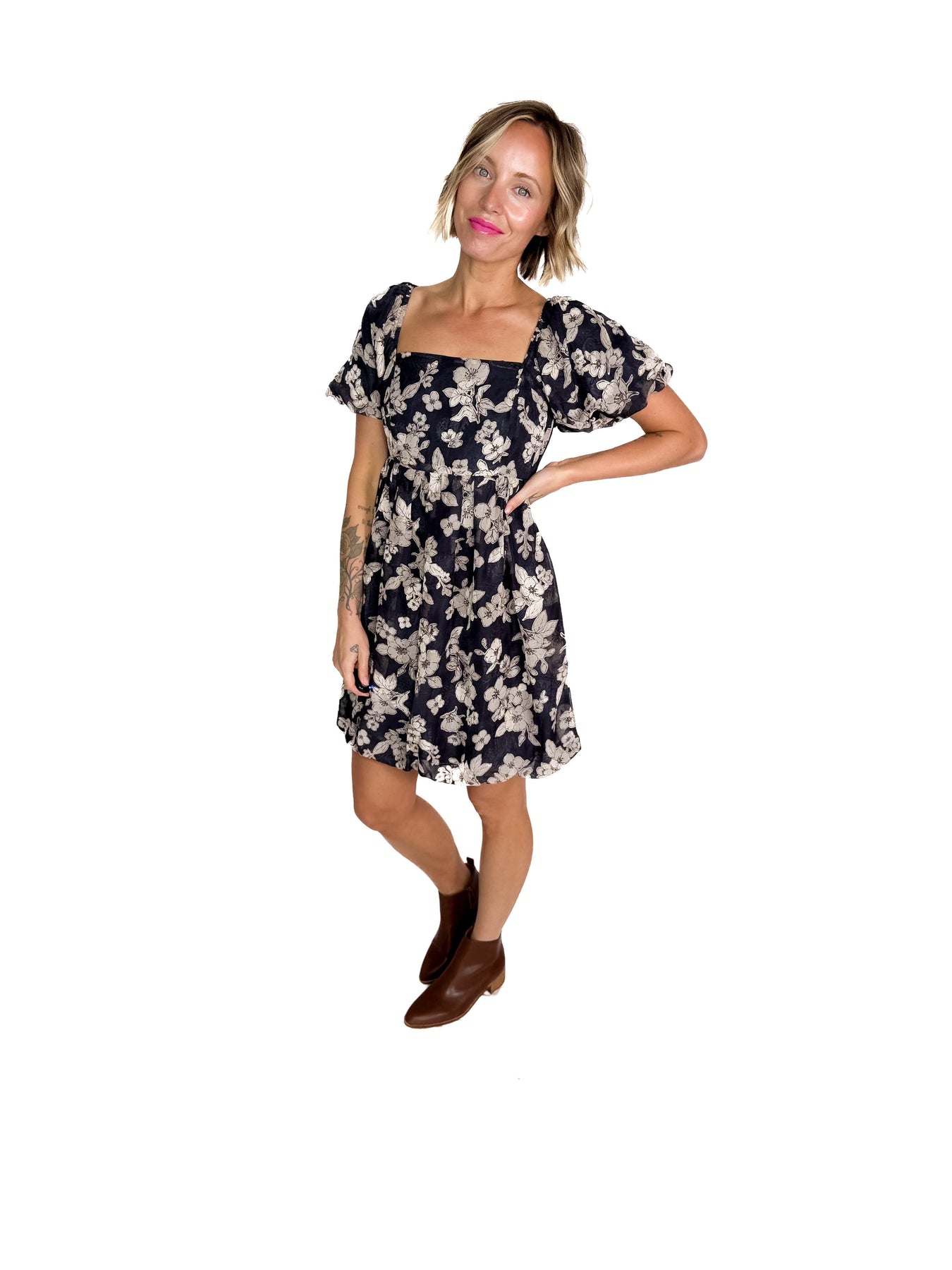 Additional: Bubble dress silhouette, mini length, puff sleeves, invisible back zipper, back tie, lined