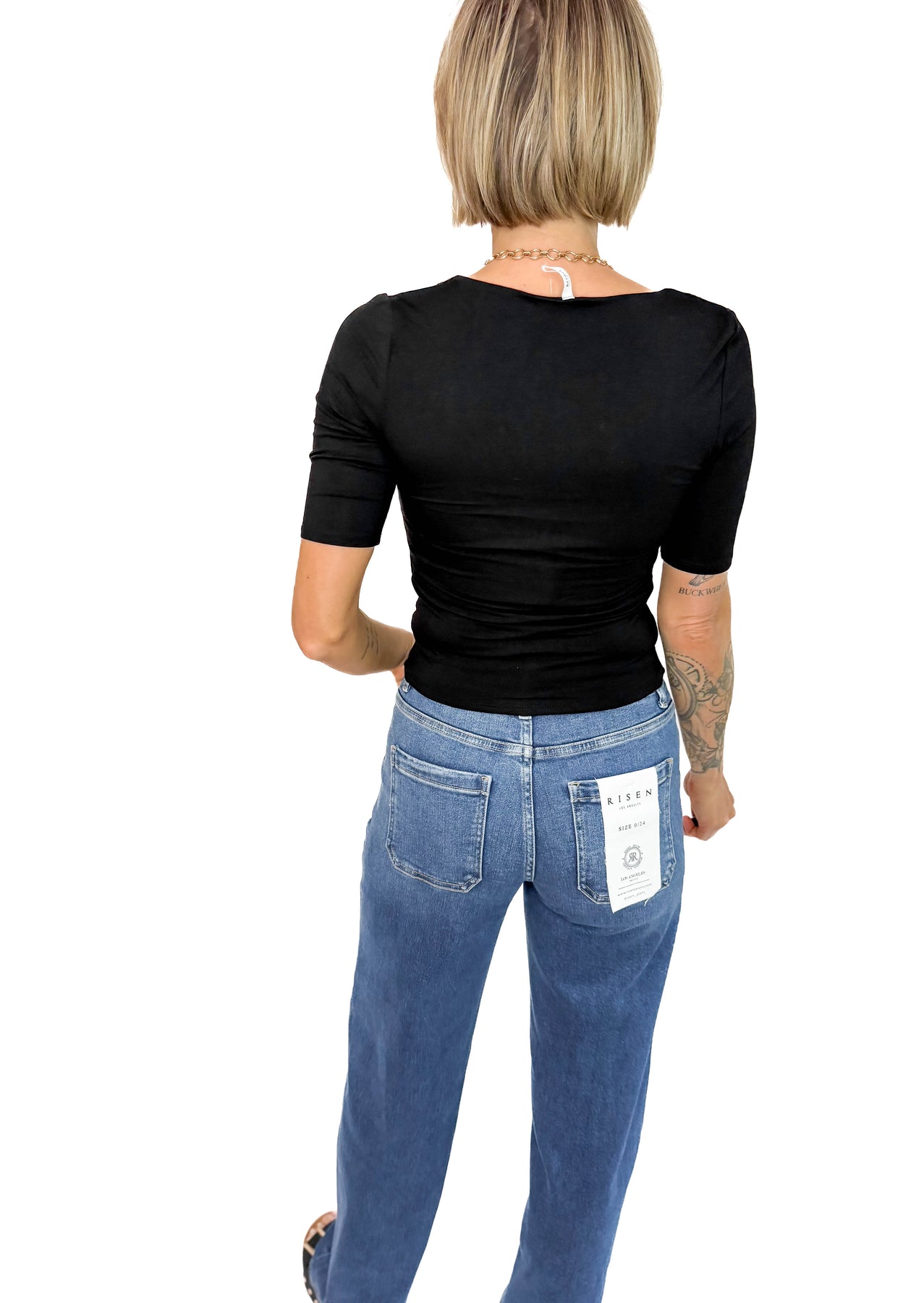 - Cropped length perfect for high-rise denim or joggers