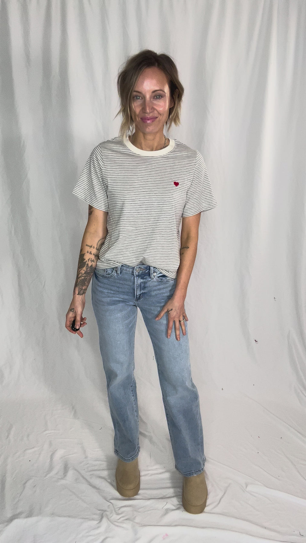 Additional: Soft Feel, Striped Pattern, Embroidered Chest Heart, Elevated Basic Tee