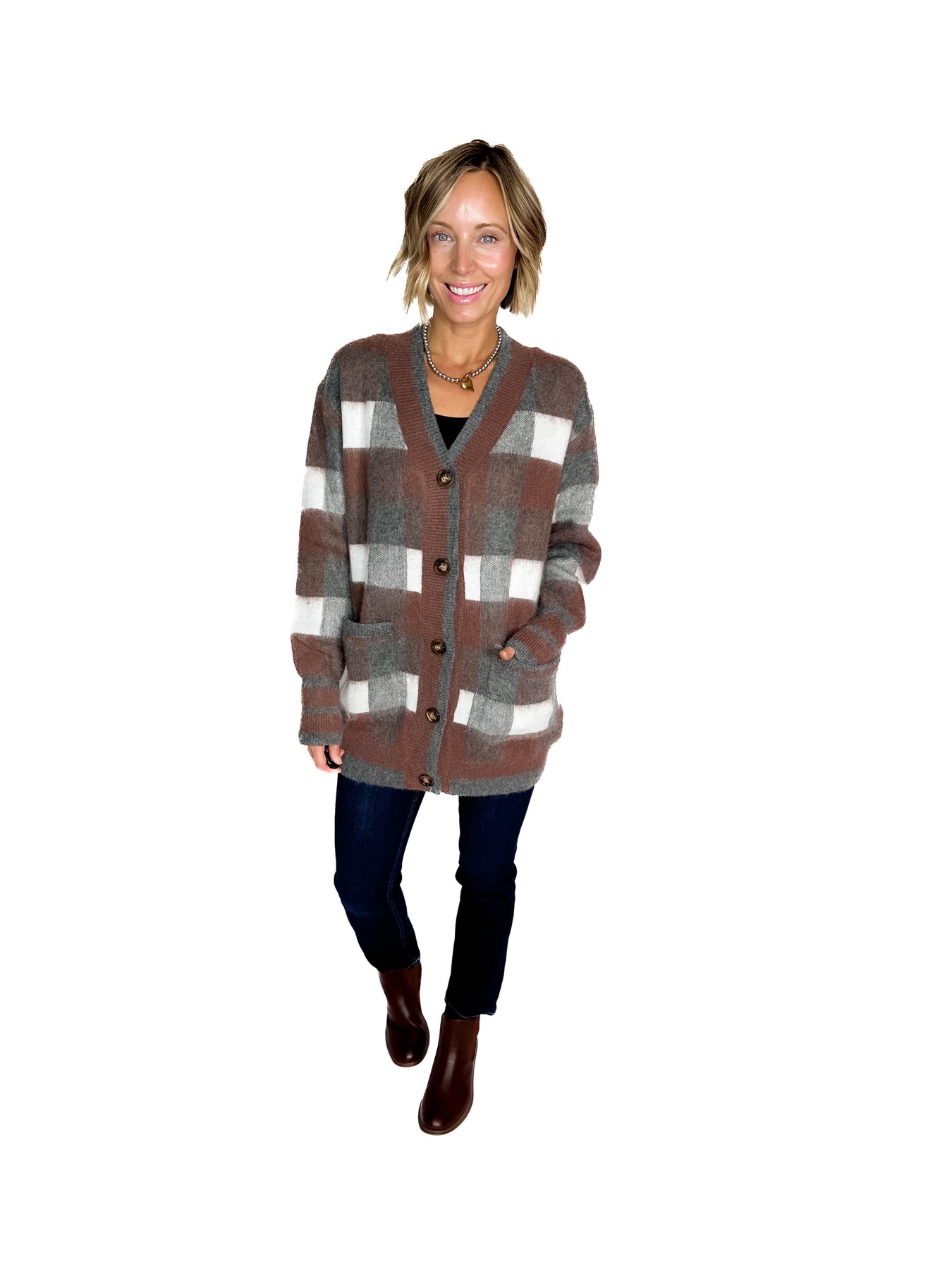 Timeless warmth—this tartan brushed cardigan brings classic patterning and cozy layers together for effortless fall style.