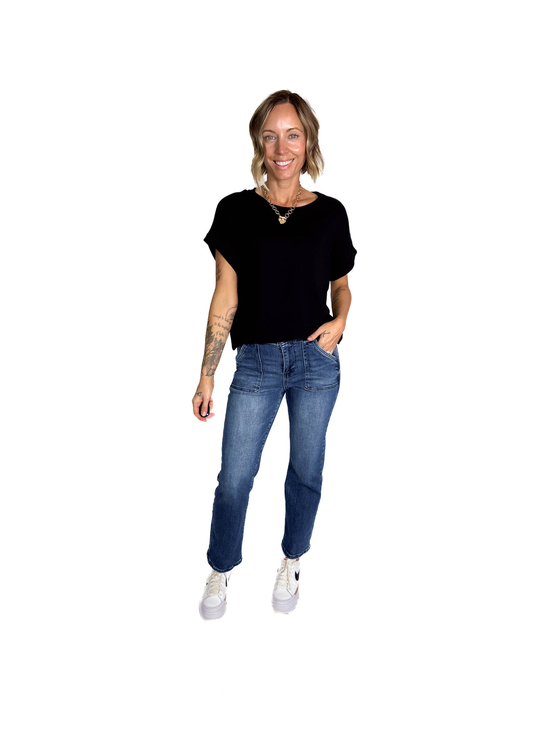 Elsie Cuffed Cotton Pocket Tee- BLACK