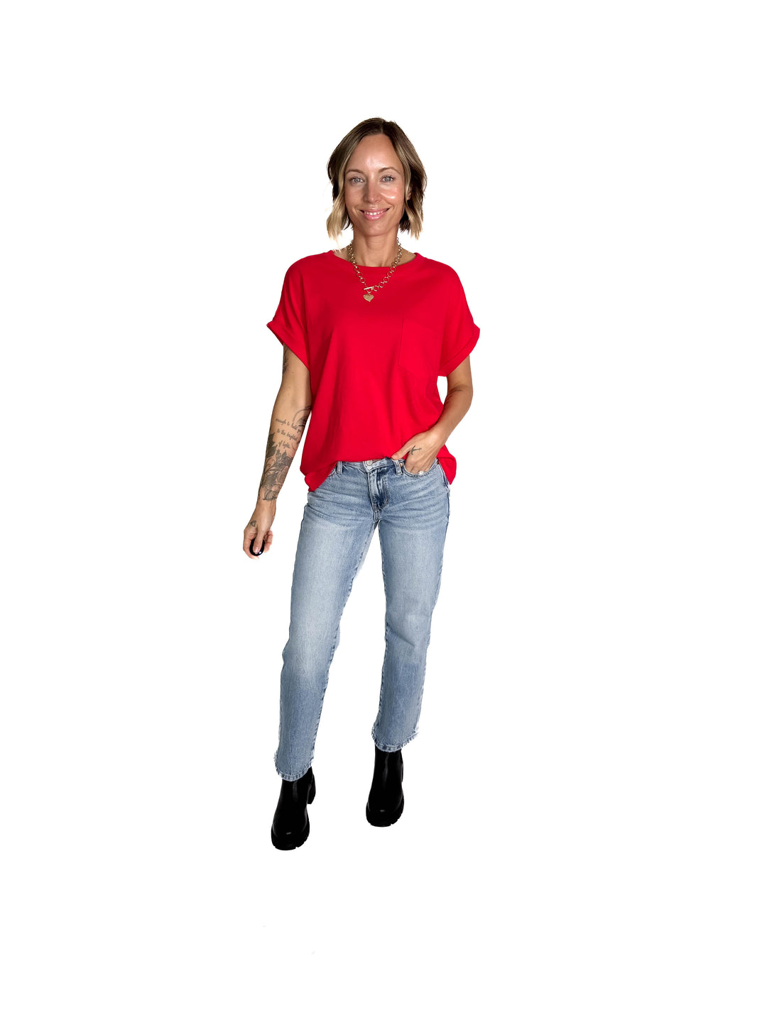 Elsie Cuffed Cotton Pocket Tee- RUBY