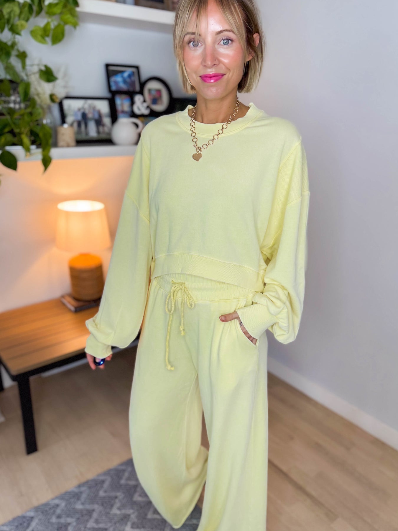 Additional: Long sleeve cropped sweater with ribbed contrast details; elastic drawstring waist pants with raw cut hem and pockets.