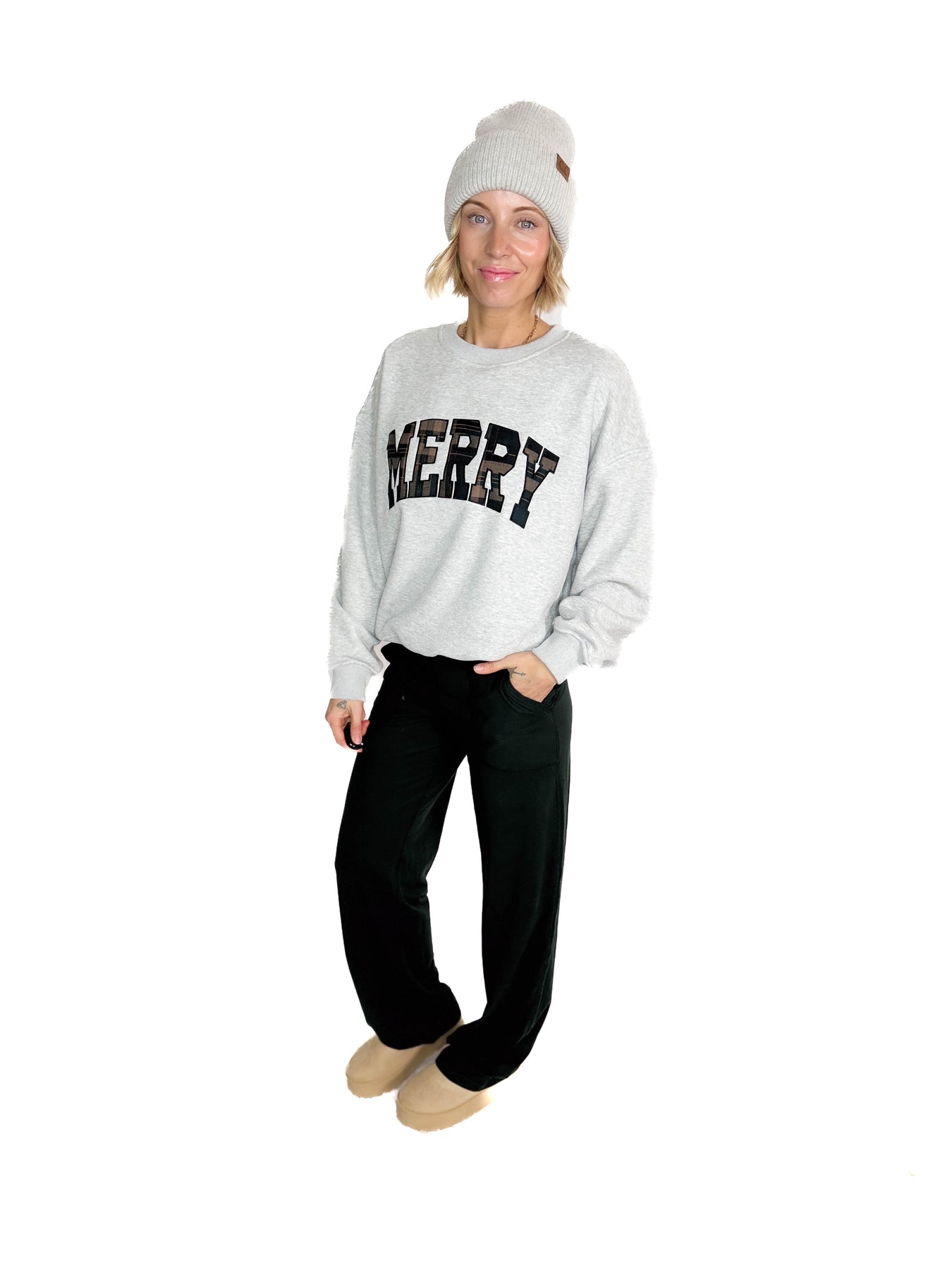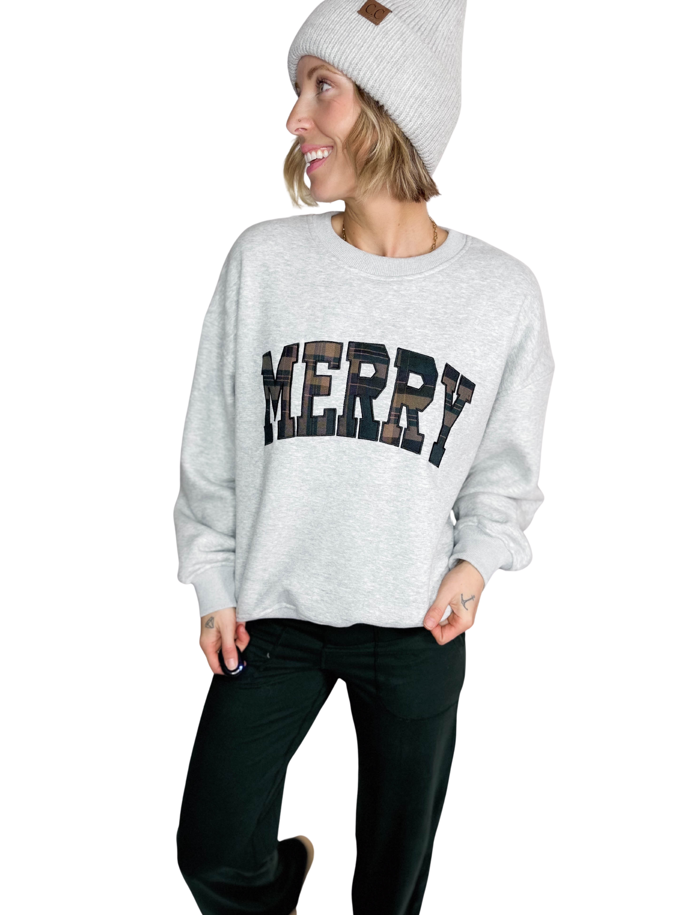 Additional: Crew Neck, Fleecy Interior, Plaid Embroidered “MERRY” Lettering, Ribbed Cuffs and Hem