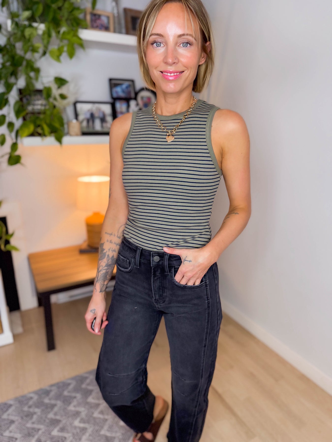 Kenna Round Neck Sleeveless Striped Bodysuit- OLIVE/NAVY STRIPE