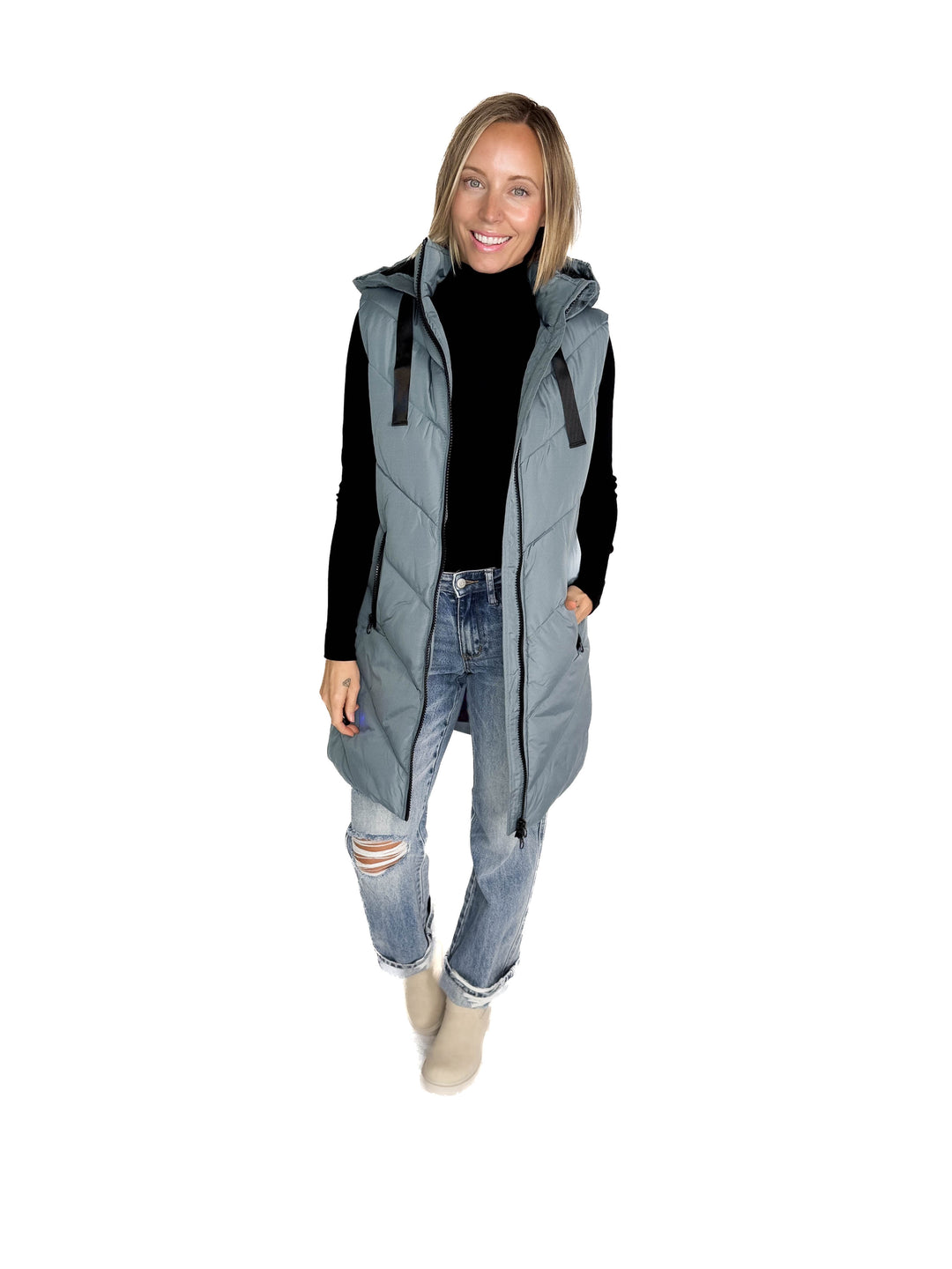 - Chunky full zipper and drawstring hood for adjustable comfort