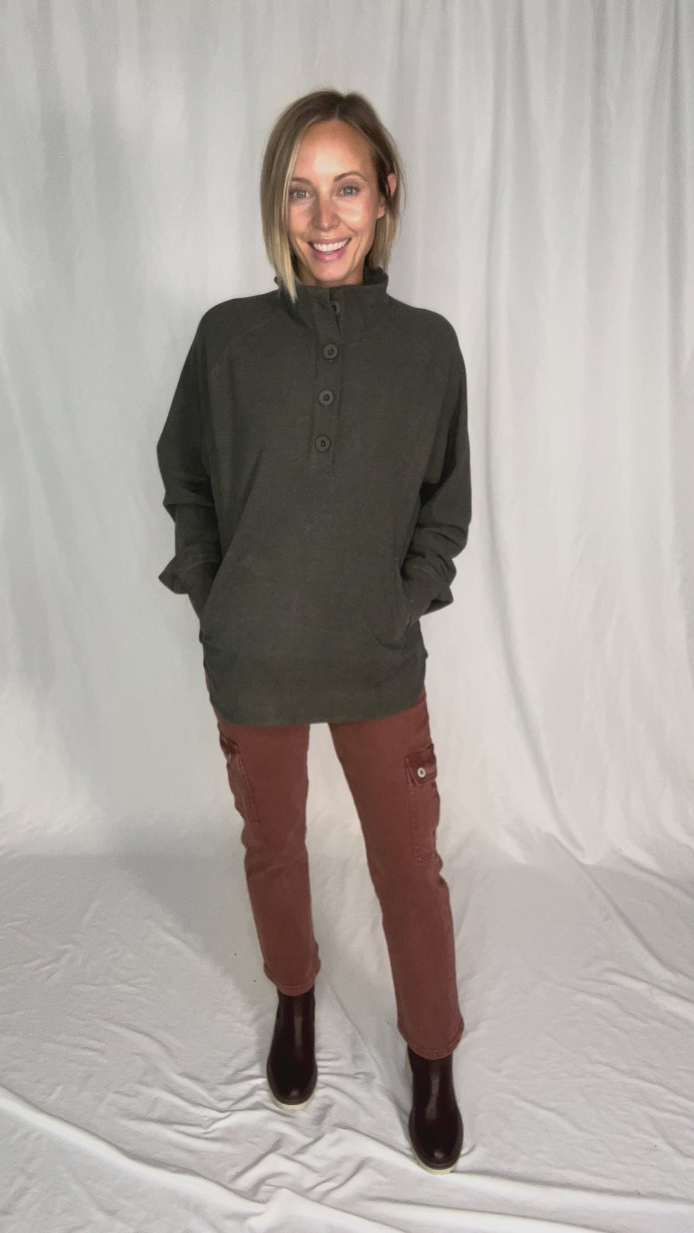 Additional: Brushed Rib, Mock Neck Pullover, Oversized, Functional Buttons, Extra Soft, Pockets, Scalloped Hem